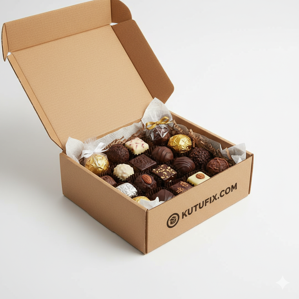 Lezzetli şekerleme ve çikolatalarınızın zarif bir sunumla taşınması için tasarlanmış kutular, 1,5 mm Kraft E dalga oluklu...